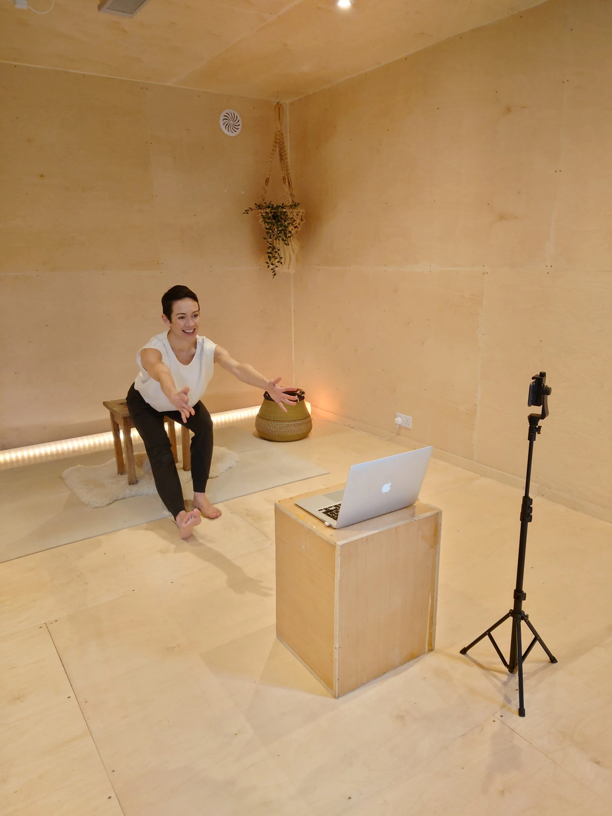 Alice, a yoga and functional movement teacher, guiding mobility and strength training in a peaceful home studio in Oakwood, Leeds.